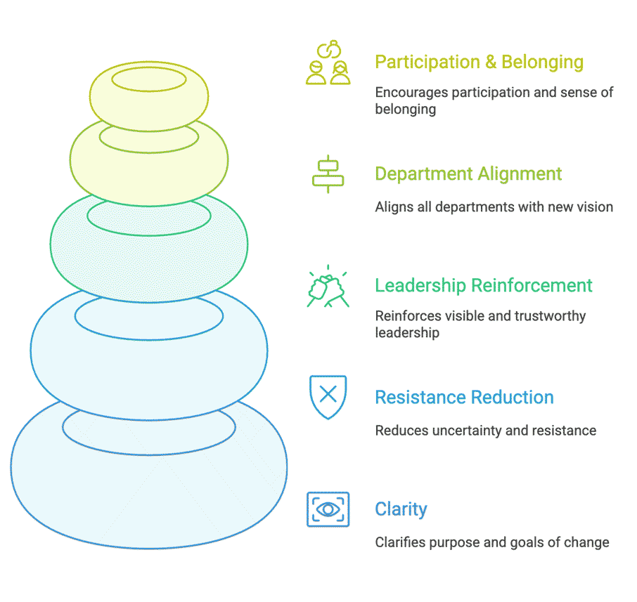 It acts as a bridge between leadership and employees. When included from the beginning, it aligns expectations, shares the purpose, and provides emotional support throughout the transition.